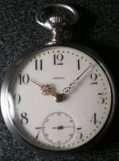 オメガの銀製懐中時計です。瀬戸引きの文字盤は縁近くのごく薄いヘアライン程度で全体には綺麗な状態です。ブレゲ針にブレゲ数字という組み合わせでシンプルながらも上品です。ケースは裏蓋にギョーシェ状の模様がありますが外周近くは薄くなっています。裏蓋中央には空欄のイニシャル欄があります。裏蓋内側にOMEGAや銀の刻印があり、中蓋にはOMEGAの刻印とともに7枚のメダリオンの刻印があります。多少の傷へこみくらいで全体にはまずまずです。機械は表面に幅広のパターンがほどこされており縁近くにOMEGAの刻印があります。経年による多少のくすみや小傷くらいで全体にはなかなか綺麗なムーブメントです。