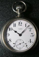 Watch Co.と記名があります。多少の傷くらいで全体にはきれいな文字盤です。ケースはしっかりとした作りの銀ケースで裏蓋内側にはSTERLINGの刻印がありますので92.5%の銀ケースです。はめ込みタイプの蓋ですが表蓋は手で開けられるくらいのかたさです。風防表面にはある程度の傷が見られます。ケースサイドはコインエッジ状で裏蓋は元はナナコ模様があったようですが現在は薄くなっています。裏蓋中央に空欄のイニシャル欄があります。多少の小傷へこみは見られますが全体としてはなかなかきれいです。中蓋もSTERLINGの刻印があり銀製です。機械は表面全体に豪華な装飾模様がほどこされており輝きが美しいです。金文字でNEW