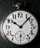 ボールの16サイズ21石のオフィシャルレイルロードスタンダードです。瀬戸引きの文字盤はBALL OFFICIAL RR STANDARD. CLEVELANDと記名があります。スモールセコンド内のほぼ見えないくらいの極薄のヘアラインがあるくらいで全体には綺麗な文字盤です。ケースはベゼル、サイド、裏蓋の縁、ネック、提げ環などに装飾がほどこされておりレイルロードケースながら豪華です。使用による小傷程度で全体にはなかなか状態の良いケースです。機械は表面に同心円状のパターンがほどこされており輝きが綺麗です。表面に金文字でBALL