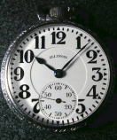 16サイズ21石のイリノイ・バンスペシャルです。瀬戸引き(陶製)の文字盤はILLINOISの記名があります。8時位置の外周にごく薄いヘアラインと縁近くに傷がありますが全体にはきれいな文字盤です。ケースはレイルロードタイプでベゼル、サイド、裏蓋の縁に細かな装飾模様があり裏蓋はストライプ模様になっています。多少の小傷くらいで全体にきれいなケースです。機械はバンスペシャル特有の放射状の模様があり表面にBunn