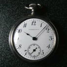 黒い瀬戸引き文字盤を持つ珍しい時計です。黒いベースに白でインデックスや目盛りがありますが、これは白で数字を書いているのではなく白以外の部分を黒に塗って製作されています。インデックスや目盛りを白抜きにしてあるという作りです。ベゼルに完全に隠れる縁のわずかなチップくらいで全体には綺麗な状態の文字盤です。風防の縁に小さなチップ。ケースは合金のラウンドケースで裏蓋内側にLONGINESの刻印があります。使用による小傷くらいでなかなか綺麗なケースです。機械はマットゴールド仕上げで縁近くにLONGINESの刻印があります。バランスコックにロンジンのマークである有翼の砂時計マークがあります。経年によるくすみはある程度見られます。丸テンプが使われており時代の古さを感じさせます。
